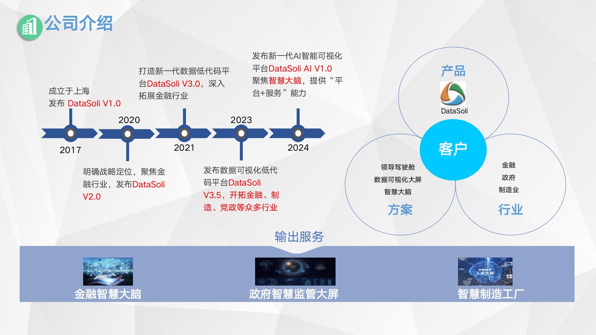 上海三循信息技术有限公司 ——引领大数据时代的科技巨人 在当今数字化时代,大数据已成为企业转型和发展的重要驱动力。上海三循信息技术有限公司,作为一家在大数据浪潮下崛起的技术型企业,以其卓越的技术实力和深厚的行业经验,在金融、政府和高端制造等领域树立了卓越的声誉。通过自主研发的第三代数据可视化低代码平台DataSoli,三循信息为客户提供全方位的数字化转型能力,致力于帮助中国企业打造智能认知力。